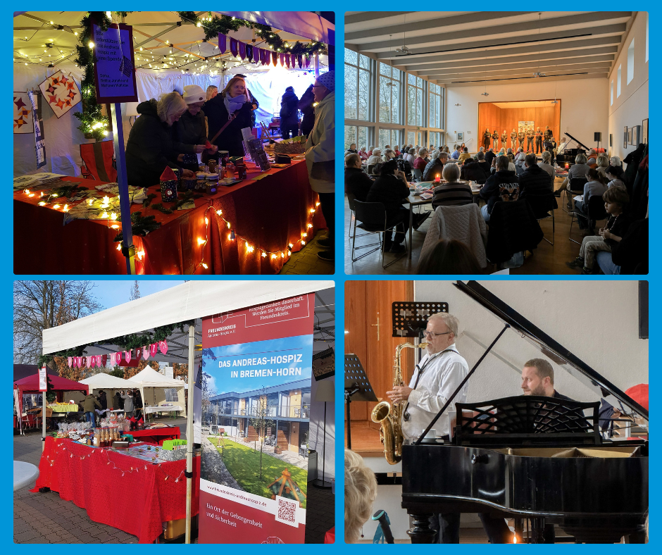 Mit viel Engagement seiner Mitglieder, der Ehrenamtlichen aus dem Hospiz und Freund:innen, die sich dem Hospiz verbunden fühlen, hat der Freundeskreis des Andreas-Hospizes am ersten Advent einen wunderschönen Stand auf dem Weihnachtsmarkt Horn-Lehe ausrichten können. Liebevoll geschmückt lockte er mit einer großen Auswahl an gespendeten Produkten wie Patchwork- und Handarbeiten, Fotokarten, Origamibasteleien sowie selbstgemachten Likören, Marmeladen, Neujahrskuchen, Plätzchen und Gebäck viele Menschen an. Auch der Glühwein-Ausschank erfreute sich großer Beliebtheit. Am Ende war der Stand nahezu „ausverkauft“ und hat einen Erlös in Höhe von 1.920 Euro für das Hospiz erzielt. Ein wunderbares Team hat diesen Erfolg ermöglicht!